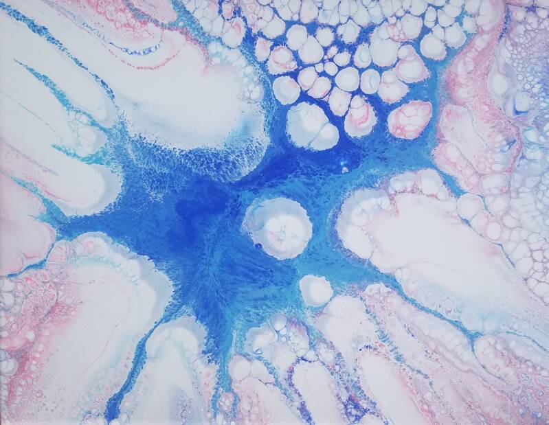 This piece came out quite unexpectedly! I used pink, magenta and dark blue Liquitex acrylic paints. Pink and blue are my two favorite colors and I really was thrilled with how this turned out. It was the first painting that came out better than I planned. Literally worked so hard to achieve this type of composition. Acrylic paints are mysterious and stubborn and absolutely amazing to work with. They have a mind of their own and will either work with you or against you! If you get the colors and composition right and have mixed and manipulated the paint just so you might produce a piece of art you can be proud of. Self taught and still learning.