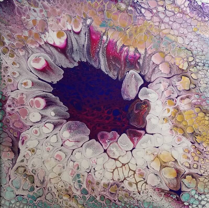 The more fluid artwork I create the more similarities I notice to human beings. Both are alive for a period of time and then become static and transition. Artwork, like humans, are born perfect but are often corrupted by the environment in which they exist. Art is fragile like the body to destruction and untimely demise. There are so many elements that can harm a beautiful body of work. The creation of art is beautiful, holy and scientific. I do my best work when I feel aligned with the Universal Energy that vibrates all around. I see and feel the energy. It is there and it brings my artwork to life. The art is alive creating within itself. Just like a child is created and then grows up to be a creator. As a creator I live in a universe that has been created to create. My art lives and breathes-in precious seconds of life creating within my creation of it. The art expands and grows at an incredible rate and fulfills a complete cycle of birth, life and death. It is always in the moment, living only to be and create. It is not caught up in its legacy but in the journey of living and creating. Does art have a consciousness like humans? Does it long to create beauty, to be beautiful? Or is its only goal to live in the moment, content to mix and flow with other pigments and additives; to form new shapes and designs with each moment it exists. When paint is in harmony with whatever it is associated it thrives and beauty is created but when mixed with the wrong elements the outcome is uncertain. This is why science and art must coalesce creating a perfect partnership. There is a rhythm and a feel to producing fluid art. When the art is wet and alive it is thrilling to watch it grow. I wait in wonderment at what will manifest and how the painting will evolve. Learn, practice, engage and then let go and trust and believe in yourself.