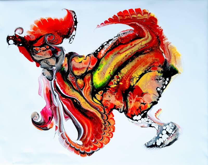 This is one of my new series of fantasy creatures. They just started materializing. Let your mind go when you look at them and hopefully you won't feel like your having a bad trip! The first creature that came to me was a delightful blue dragon. He looks simple and silly but he was born out of much work. Now I have expanded my menagerie with creatures that look like they come from another planet! I am thrilled with their zany designs and vivid colors. I have always wanted to do things outside the box, not wanting to follow the norm or conventionality. I have longed to be able to design something original and not just copy others or keep reinventing the wheel. I started really doing this with my colored dog series which can be seen in my Olderwork/Dog Art section. I stopped wanting to draw or paint reality and instead stared creating fantasy which is so much more fun and fulfilling. In my pictures I see things that delight and surprise me and not everyone sees what I see and that's ok. Even my Florals artwork is filled with fantasy with its fluidity and fantastic boldness. Stepping outside the box feels good like throwing your arms up and spinning like a dervish!