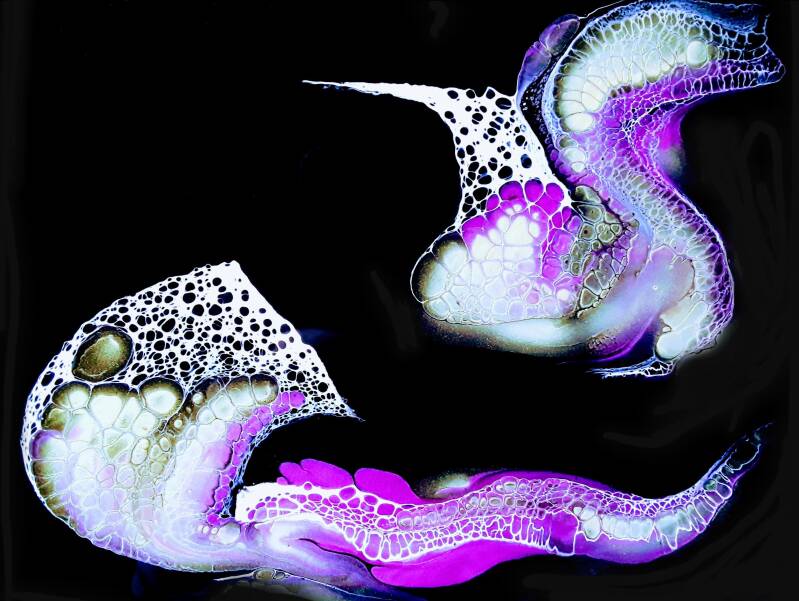 The bugs I contend with may not carry malaria or bite me in my sleep but they nonetheless irritate the life out of me! They seem to delight in messing with my artwork. They steal into my freshly poured paint and like burglars steal away my little piece of perfection! They are a plaque upon my house. These dim witted, miniscule monsters create mayhem and haunt me every time I wait for my piece of art to dry. They silently slip into a pool of poured pigment sliding and sloshing through a surface of intricate images changing composition and form until it looks like a 2 yr old has been finger painting. What are they attracted to? Is it the glossy sheen of the wet acrylic? Or is it the strong toxic smell. Maybe they see in color and are drawn to the striking tones. I wish I knew. Even when I carefully net my paintings they still find a way to break in and take off with their feet and antennae loaded with pinks, purples, prussian blues and every other magnificent shade. I do feel slightly sorry for them when they don't make it off the glistening canvas and die a most glorious death etched in my artwork, immortalizing themselves by becoming now a part of the painting. Sneaky little Buggers!